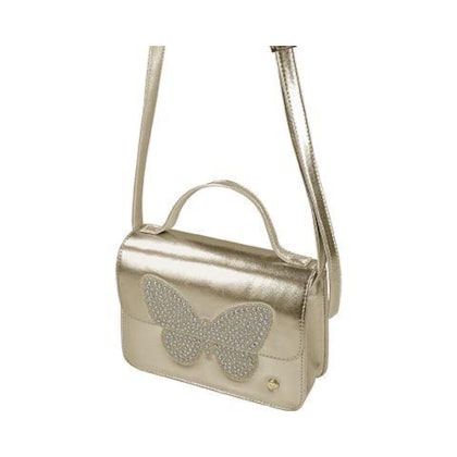 Bolsa infantil com design estruturado e acabamento metalizado, ideal para compor looks festivos ou casuais com um toque de brilho. O modelo apresenta uma aplicação frontal em formato de borboleta cravejada com strass, garantindo um visual lúdico e sofisticado. Possui alça de mão fixa e alça tiracolo ajustável, oferecendo versatilidade e conforto no transporte. O fechamento por aba frontal com botão magnético proporciona segurança e facilidade no manuseio. Um acessório charmoso que une praticidade e estilo para diversas ocasiões.