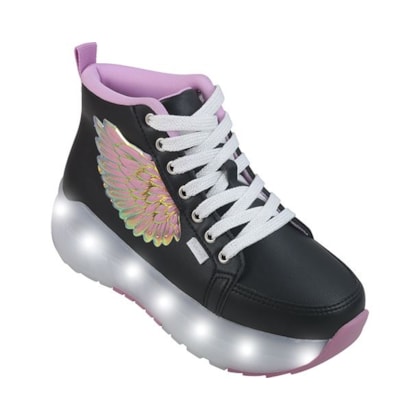 Sneaker infantil com rodinha removível e luz de LED no solado, com design lúdico e moderno, ideal para unir estilo e diversão no dia a dia. O modelo destaca-se pelo detalhe lateral em formato de asa com acabamento metalizado e pelo solado translúcido equipado com sistema de luzes de LED, que são acionadas a cada passo. Possui fechamento por cadarço para ajuste seguro e colarinho acolchoado que garante conforto ao tornozelo. Construído com materiais leves e resistentes, oferece durabilidade para as brincadeiras, mantendo um visual cheio de personalidade e magia para os pequenos.