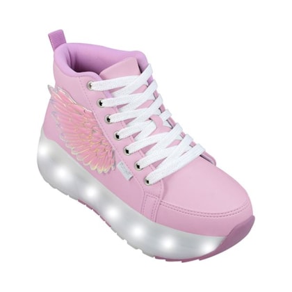 Sneaker infantil com rodinha removível e luz de LED no solado, com design lúdico e moderno, ideal para unir estilo e diversão no dia a dia. O modelo destaca-se pelo detalhe lateral em formato de asa com acabamento metalizado e pelo solado translúcido equipado com sistema de luzes de LED, que são acionadas a cada passo. Possui fechamento por cadarço para ajuste seguro e colarinho acolchoado que garante conforto ao tornozelo. Construído com materiais leves e resistentes, oferece durabilidade para as brincadeiras, mantendo um visual cheio de personalidade e magia para os pequenos.