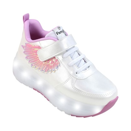 Tênis infantil com rodinha removível e luz de LED no solado, apresentando detalhe lateral em formato de asa holográfica. O modelo possui fechamento prático que combina cadarço elástico e fita dupla aderente, facilitando o calce e garantindo ajuste firme. O cano e a lingueta acolchoados proporcionam conforto, enquanto o solado translúcido destaca a iluminação a cada passo. Une estilo e diversão, permitindo o uso tanto para caminhar quanto para deslizar. Estrutura resistente com acabamento pespontado e puxador traseiro que auxilia no calce.